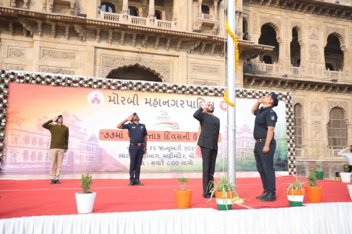 મોરબી મહાનગરપાલિકા દ્વારા 77 માં પ્રજાસત્તાક પર્વની ઉજવણી મણી મંદિર ખાતે કરાઈ હતી, પ્રજાસત્તાક પર્વ નિમિત્તે મનપાના કમિશનર સ્વપ્નિલ ખરે એ ધ્વજવંદન કરી રાષ્ટ્રધ્વજને સલામી આપી હતી.