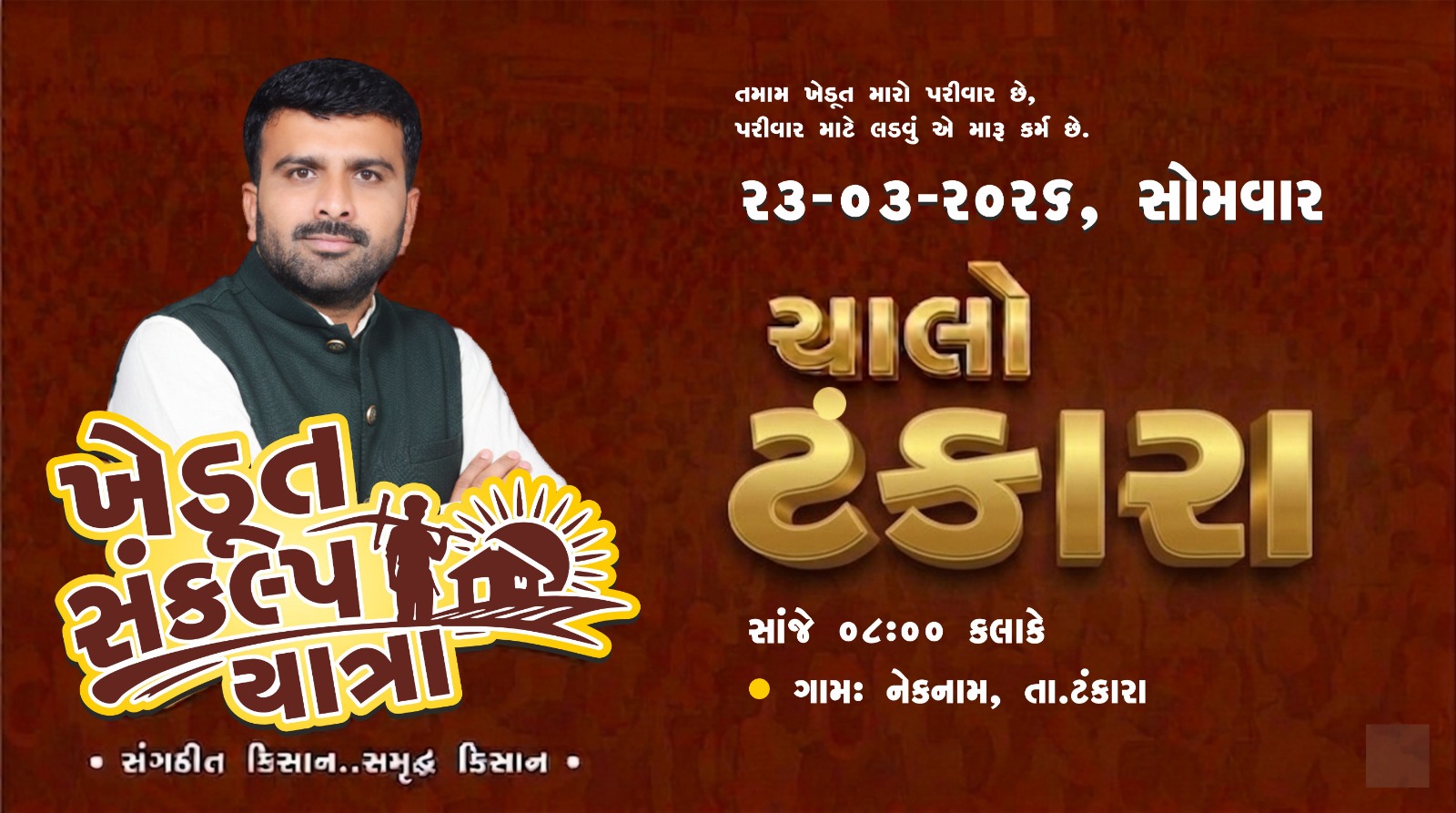 મળતી માહિતી મુજબ, આજે તા. ૨૩/૦૩/૨૦૨૬ સોમવારના રોજ રાત્રે ૮:૦૦ કલાકે “પડઈનીય સંકલ્પ યાત્રા” અંતર્ગત નેકનામ ગામે ખેડૂત સભા યોજાશે. જેમાં રાજુભાઈ કરપડા ખેડૂતોએ સંબોધિત કરશે. આ કાર્યક્રમમાં “સંગઠિત કિસાન, સમૃદ્ધ કિસાન”ના સૂત્ર સાથે ખેડૂતોને એકતા અને હક્ક માટે લડવા પ્રેરણા આપવામાં આવશે. રાજુભાઈ કરપડાએ સંદેશ આપ્યો છે કે, “તમામ ખેડૂત મારો પરિવાર છે અને પરિવાર માટે લડવું એ મારું કર્મ છે.” આ સભામાં મોટી સંખ્યામાં ખેડૂતો ઉપસ્થિત રહે તેવી શક્યતા વ્યક્ત કરવામાં આવી રહી છે.