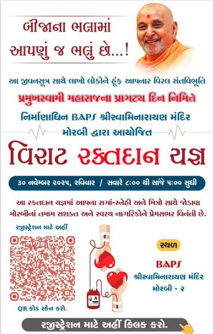 મોરબી શહેરમાં પ્રમુખ સ્વામી મહારાજના પ્રાગટ્ય દિન નિમિતે માનવસેવાને અર્પિત વિશાળ રક્તદાન યજ્ઞનું આયોજન BAPS શ્રી સ્વામીનારાયણ મંદિર, મોરબી દ્વારા કરવામાં આવ્યું છે. “બીજાના ભલામાં આપણું જ ભલું છે” જેવા જીવનમંત્રથી પ્રેરાઈને કરોડો હૃદયોને સ્પર્શનાર પ્રમુખ સ્વામી મહારાજની યાદમાં દર વર્ષે અનેક સેવાકાર્યો યોજાતા આવ્યા છે. આ વર્ષ મોરબી ખાતે નિર્માણાધીન મંદિર પરિસરમાં વિશાળ રક્તદાન યજ્ઞનું આયોજન કરવામાં આવ્યું છે. આ રક્તદાન યજ્ઞ આવતીકાલે તા.૩૦ નવેમ્બર ૨૦૨૫ને રવિવારે સવારે ૮ થી સાંજે ૫ વાગ્યા સુધી BAPS શ્રી સ્વામીનારાયણ મંદિર, મોરબી ખાતે યોજાશે. દેશમાં દર વર્ષે અનેક દર્દીઓ રક્તના અભાવે જીવન ગુમાવતા હોય છે. એક વ્યકિતનું રક્તદાન તદ્દન ઓછા સમયમાં ત્રણ જણનું જીવન બચાવી શકે છે, એવું તબીબી રીતે સાબિત થયું છે. તેથી આ પવિત્ર અને માનવ કલ્યાણકારક સેવા કાર્યમાં મોરબીના તમામ સ્વસ્થ, સક્ષમ નાગરિકો સાથે તેમના સગાં-સ્નેહીઓ અને મિત્રો સહભાગી થાય તેવી વિનંતી આયોજકો દ્વારા કરવામાં આવી છે.