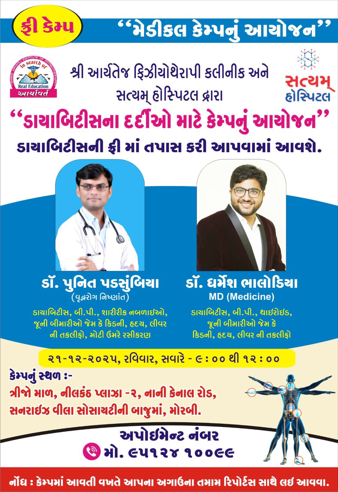 શ્રી આર્યતેજ ફિઝીયોથેરાપી ક્લિનિક અને સત્યમ હોસ્પિટલના સંયુક્ત ઉપક્રમે મોરબી શહેરમાં ડાયાબિટીસના દર્દીઓ માટે નિઃશુલ્ક મેડિકલ કેમ્પનું આગામી તારીખ ૨૧-૧૨-૨૦૨૫ના રોજ આયોજન કરવામાં આવ્યું છે.