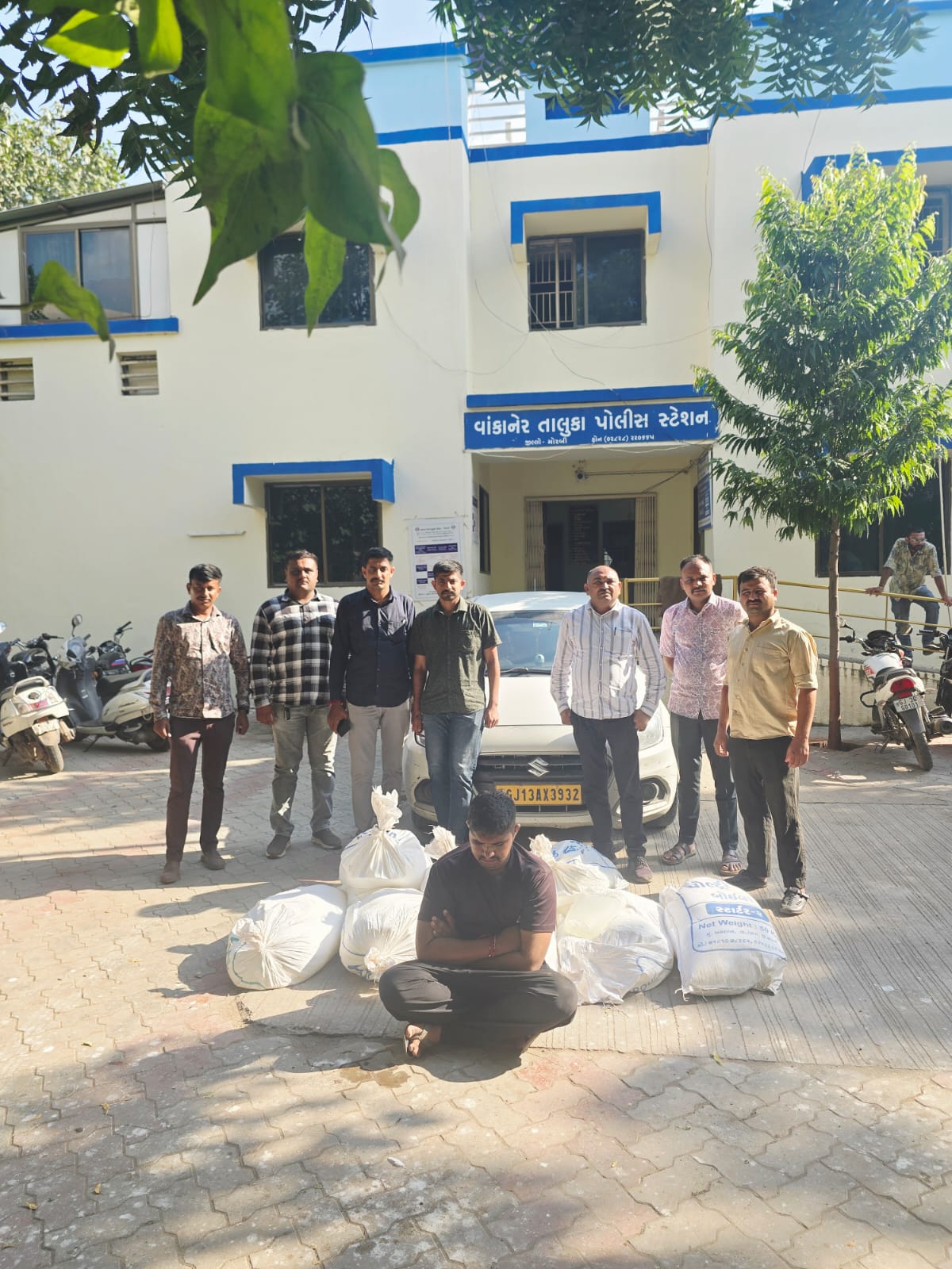 મળતી માહિતી અનુસાર, વાંકાનેર તાલુકા સર્વેલન્સ ટીમ આજ રોજ પોસ્ટે વિસ્તારમા પેટ્રોલીંગમા હતી. તે દરમિયાન તેઓને મળેલ બાતમીના આધારે, વાંકાનેરથી મોરબી તરફ જતા ઢુવા ગામની સીમમા નેશનલ હાઈવે રોડ ઉપર આવેલ ગેલભવાની હોટલ પાસેથી રોડ પરથી મારૂતી સુઝુકી કંપનીની સફેદ કલરની GJ-13-AX-3932 નંબરની સ્વીફટ ડીજાયર કારમાથી રૂ.૮૦,૦૦૦/-ની કિંમતનો ૪૦૦ લીટર દેશી દારૂ તથા સ્વીફટ ડીજાયર કારની કિંમત રૂ.૫,૦૦,૦૦૦/- તથા મોબાઈલ ફોન મળી કુલ રૂ.૫,૯૦,૦૦૦/- ના મુદ્દામાલ સાથે ધર્મેશભાઈ રમેશભાઈ મેટાળીયાને પકડી પાડી તેમજ દેશી દારૂનો જથ્થો મંગાવનાર રવિભાઈ ઉર્ફે માસ તથા જથ્થો મોકલનાર વિજ્યભાઈ ઉર્ફે ભુરો વાલજીભાઈ માલકીયાની શોધખોળ ચાલુ હોય જેથી ઇસમો વિરૂધ્ધ પ્રોહીબીશન મુજબનો ગુન્હો રજી. કરી કાયદેસરની કાર્યવાહી કરવામા આવી છે.