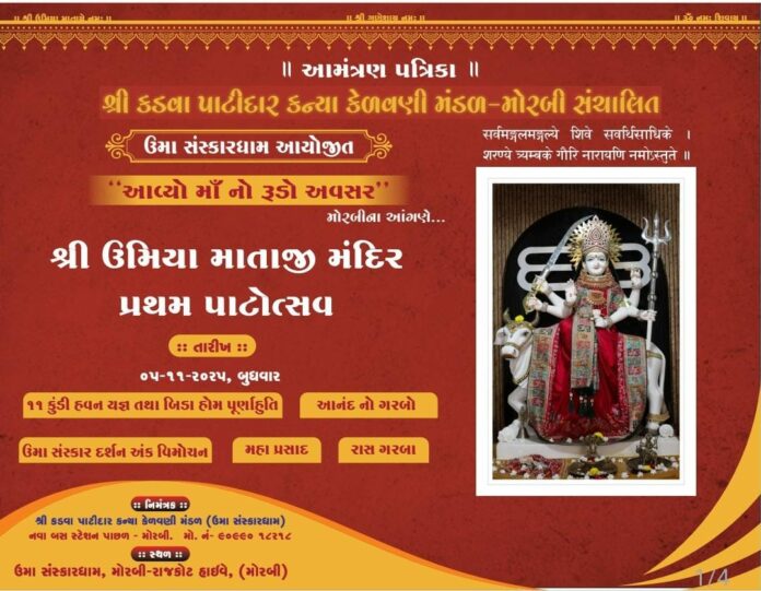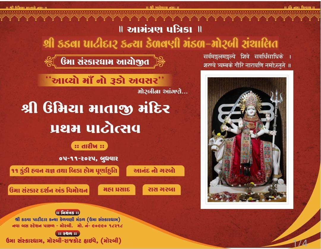 મોરબીના કડવા પાટીદાર કન્યા કેળવણી મંડળ દ્વારા સંચાલિત ઉમા સંસ્કાર ધામના પ્રથમ પાટોત્સવ નિમિતે અનેકવિધ કાર્યક્રમો યોજાશે