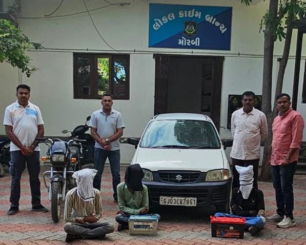 મોરબી જીલ્લામાં તાજેતરમાં બનેલ લૂંટ અને વાહનચોરીના બે ગંભીર ગુનાઓનો ભેદ મોરબી ક્રાઇમ બ્રાંચે ઉકેલી ત્રણ આરોપીઓને ઝડપી લીધા છે. અગાઉ તા. ૦૭/૦૮/૨૦૨૫ના રોજ હળવદ-માળીયા હાઇવે પર તુલશીવન પેટ્રોલપંપ પાસે એક ટ્રકનું ટાયર ફાટી જતા ડ્રાઇવર કેબિનમાં સૂતો હતો. આ દરમિયાન અજાણ્યા ઇસમોએ ફોર વ્હીલ કારમાં આવી ટ્રકમાંથી બેટરી કાઢવાનું શરૂ કર્યું. ડ્રાઇવરે રોકવાનો પ્રયાસ કરતાં તેને લાકડાના ધોકા વડે માર મારી અને રૂ. ૫,૦૦૦/- રોકડ તથા બે બેટરી મળી કુલ રૂ. ૧૫,૦૦૦/-ની લૂંટ કરી ફરાર થયા હતા. જ્યારે બીજી ચોરીની ઘટનામાં તા. ૧૬/૦૯/૨૦૨૫ના રોજ મોરબી કાંતીનગર ચામુંડા સ્ટોર પાસે રહેતા અસલમભાઈ સંઘવાણીના હીરો સ્પ્લેન્ડર પ્લસ રજી.નં. જીજે-૩૬-એએસ-૯૭૩૭ મોટર સાયકલ ચોરી થઈ હતી.