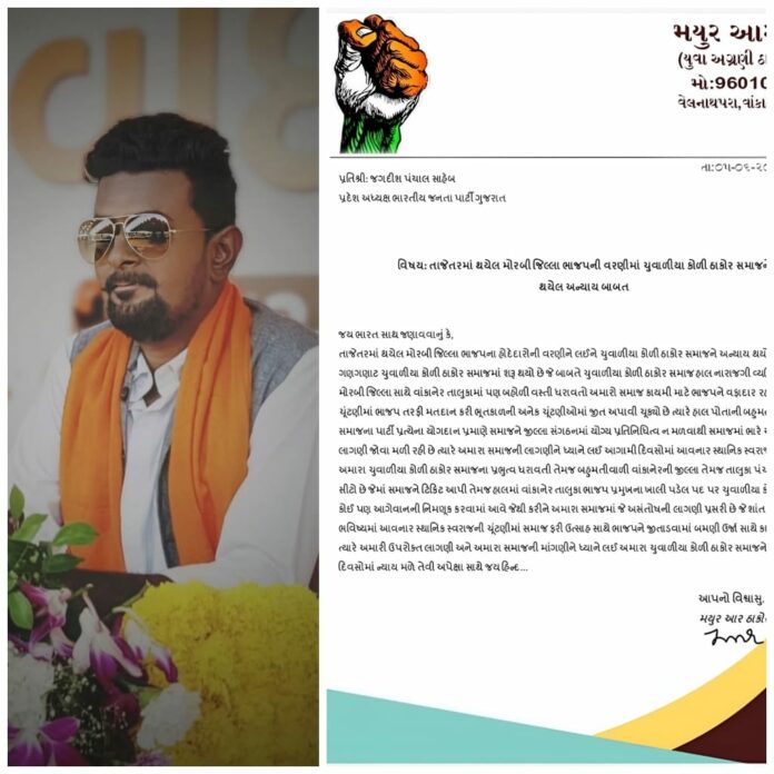 મોરબી જીલ્લામાં ભાજપના તાજેતરમાં જાહેર થયેલ હોદ્દેદારોની વરણીમાં ચુવાળીયા કોળી સમાજના પ્રતિનિધિને સ્થાન ન મળ્યાનો આક્ષેપ કરી સમાજમાં નારાજગી જોવા મળી રહી છે. વાંકાનેરના યુવા અગ્રણી મયુર ઠાકોરે ભાજપ પ્રદેશ અધ્યક્ષ જગદીશ પંચાલને લેખિત રજૂઆત કરી સમાજના આગેવાનની વરણી તેમજ આગામી ચૂંટણીમાં ટીકીટ આપવાની માંગ કરી છે.