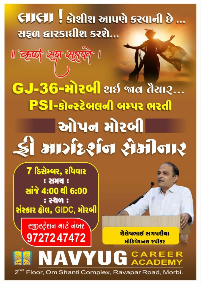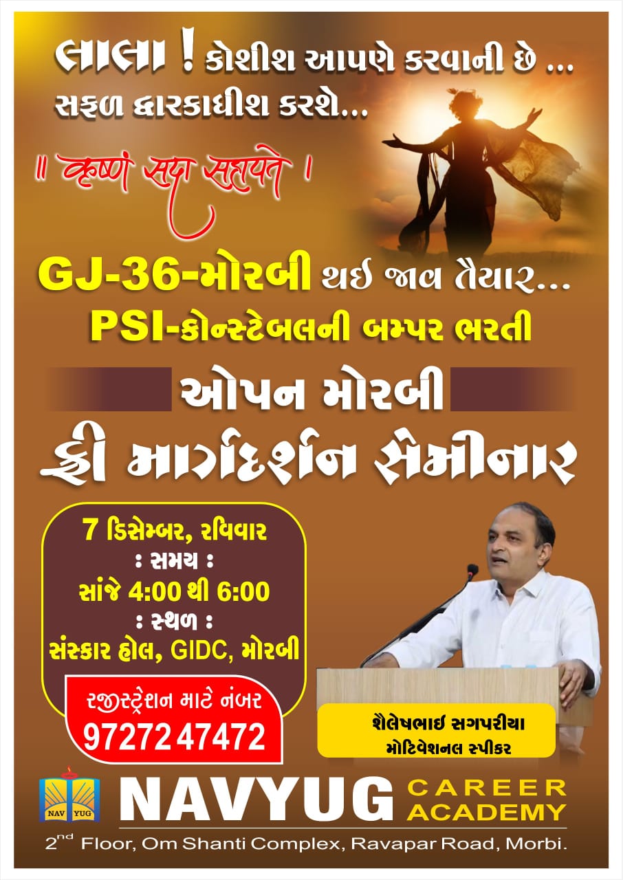 હાલ ખૂબ જ મોટી સંખ્યામાં પોલીસ વિભાગમાં ભરતી આવી છે ત્યારે PSI/ કૉન્સ્ટેબલની પરીક્ષા માટે ફ્રી માર્ગદર્શન સેમિનારનું આયોજન નવયુગ કરીઅર એકેડમી દ્વારા કરવામાં આવ્યું છે.