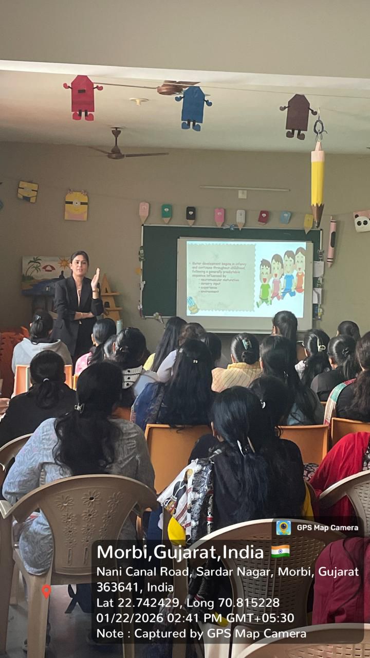 આ વ્યાખ્યાનમાં શ્રી આર્યતેજ ઇન્સ્ટિટ્યૂટ ઑફ ફિઝિયોથેરાપીના સહાયક પ્રાધ્યાપક તથા ક્લિનિકલ ઇન્ચાર્જ ડૉ. હિરલ જાદવાની મુખ્ય વક્તા તરીકે ઉપસ્થિત રહ્યા હતા. તેમણે બાળકોમાં સ્થૂળ મોટર કુશળતાઓ જેમ કે ચાલવું, દોડવું, કૂદવું તેમજ સૂક્ષ્મ મોટર કુશળતાઓ જેમ કે પકડ, લખાણ, ખાવા તથા પહેરવાની કુશળતાઓના વિકાસ અંગે સરળ અને વ્યવહારુ માર્ગદર્શન આપ્યું હતું. ઉપરાંત, મોટર વિકાસમાં થતી વિલંબજન્ય મુશ્કેલીઓ, તેની વહેલી ઓળખ તથા તેવા સંજોગોમાં ફિઝિયોથેરાપીની મહત્વપૂર્ણ ભૂમિકા અંગે પણ વિગતવાર માહિતી આપવામાં આવી હતી.