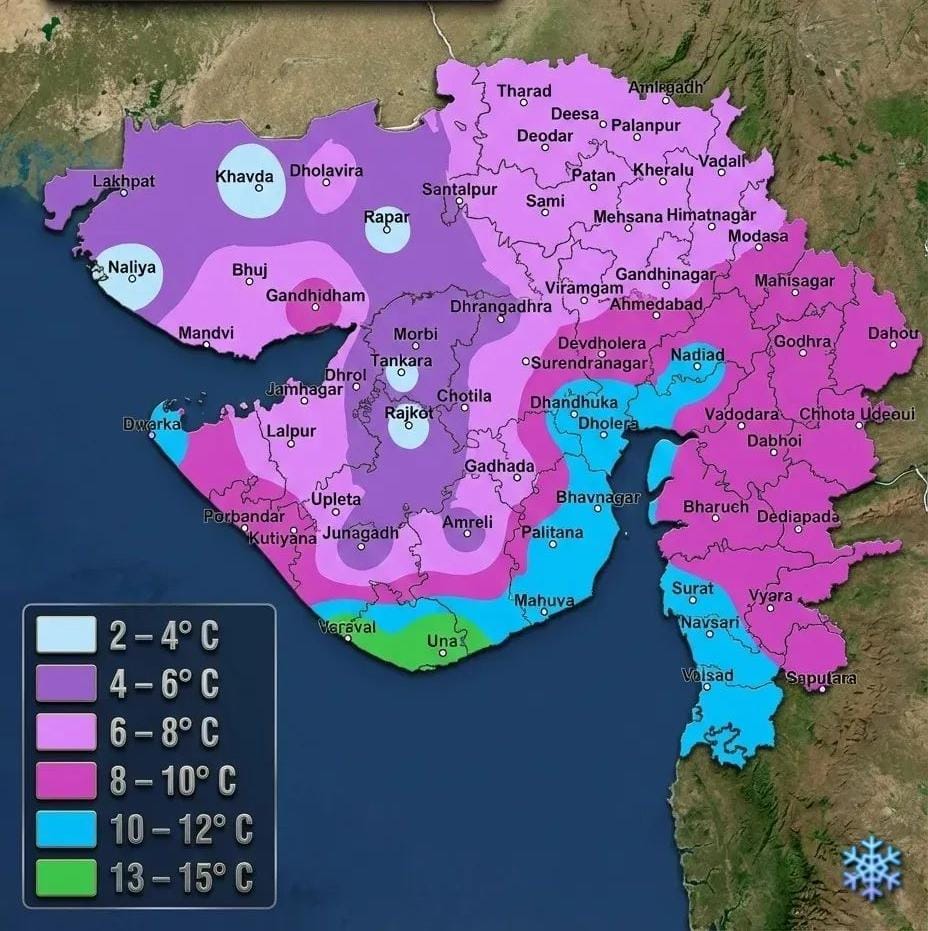 આ પછી રાજ્યમાં ફરીથી કોલ્ડવેવની પકડ મજબૂત થવાની છે. આગામી 24થી 26 જાન્યુઆરી દરમિયાન કચ્છ, સૌરાષ્ટ્ર અને ઉત્તર ગુજરાતના ભાગોમાં વ્યાપક રીતે ન્યૂનતમ તાપમાન લો થી મિડ સિંગલ ડિજિટ (°C) સુધી ઉતરી શકે છે. રાજકોટ, ટંકારા અને આસપાસના વિસ્તારોમાં કાંતિલ ઠંડી પડશે.