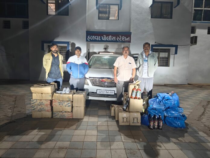 મળતી માહિતી મુજબ, હળવદ તાલુકાના ચરાડવા ગામની સીમમાં હળવદ પોલીસની ટીમ પેટ્રોલિંગમાં હતી. તે દરમિયાન તેઓ દ્વારા શંકાસ્પદ કારમાં તપાસ હાથ ધરવામાં આવી હતી. તપાસ દરમિયાન GJ-12-BE-1111 નંબરની કારમાંથી અલગ-અલગ બ્રાન્ડની વિદેશી દારૂની બોટલો મળી આવી હતી. જેથી પોલીસે કુલ ૧૧૮૮ બોટલ વિદેશી દારૂ કિ. ૩,૯૮,૪૦૦ અને કાર .રૂ ૫,૦૦,૦૦૦/- મળી કુલ રૂ.૮,૯૮,૪૦૦/-નો મુદ્દામાલ કબ્જે કર્યો હતો. આ મામલે હાલવદ પોલીસ સ્ટેશનમાં પ્રોહિબિશન એક્ટ હેઠળ ગુનો નોંધવામાં આવ્યો છે અને આગળની કાર્યવાહી હાથ ધરવામાં આવી રહી છે.