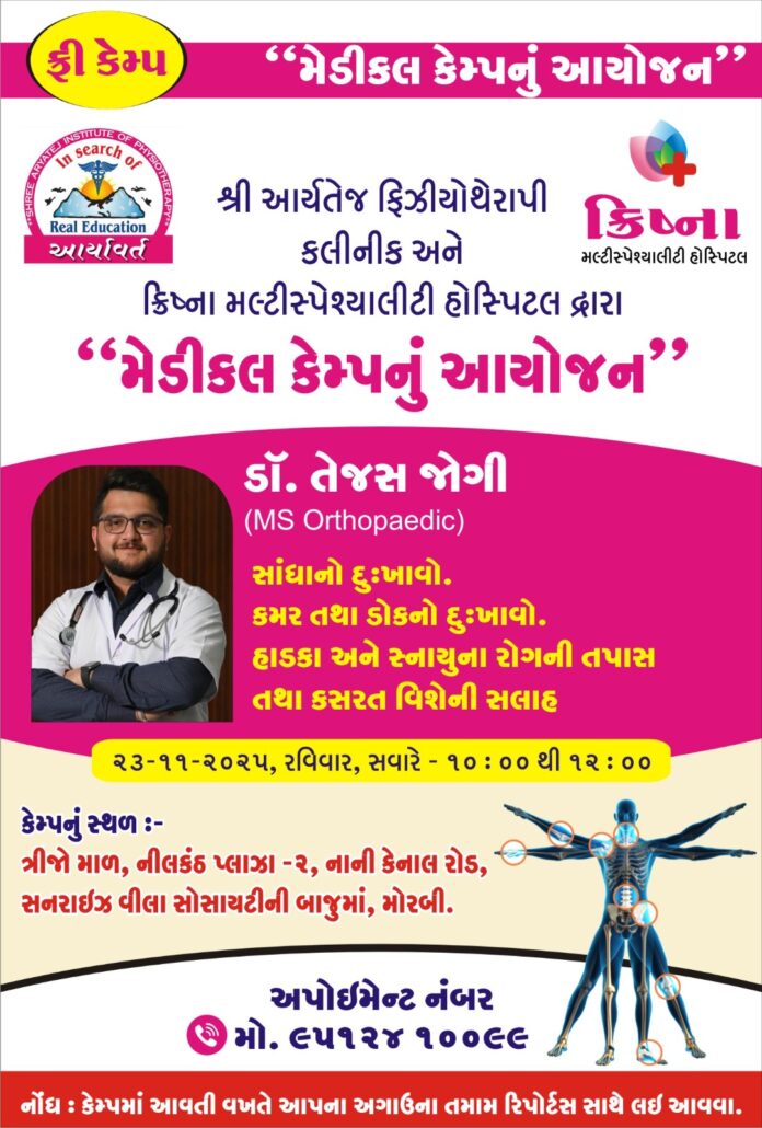 મોરબીમાં શ્રી આર્યતેજ ફિઝીયોથેરાપી ક્લિનિક અને ક્રિષ્ના મલ્ટીસ્પેશ્યાલીટી હોસ્પિટલ દ્વારા ફ્રી મેડીકલ કેમ્પ યોજાશે