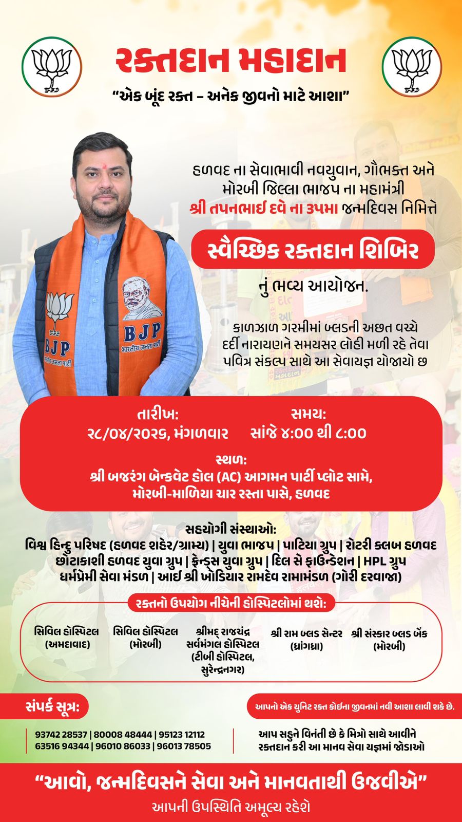 હળવદના સેવાભાવી અગ્રણી, ગૌભક્ત અને મોરબી જિલ્લા ભાજપના મહામંત્રીશ્રી તપનભાઈ દવેના ૩૫મા જન્મદિનને યાદગાર અને પ્રેરણાદાયી બનાવવાના શુભ આશય સાથે હળવદ ખાતે એક વિશાળ સ્વૈચ્છિક રક્તદાન શિબિરનું આયોજન કરવામાં આવ્યું છે. વર્તમાન ગરમીના દિવસોમાં બ્લડ બેંકોમાં લોહીની વધતી જતી અછતને ધ્યાને રાખી, જરૂરિયાતમંદ દર્દીઓને સમયસર રક્ત મળી રહે તેવા ઉમદા હેતુથી આ સેવાકીય પ્રકલ્પ હાથ ધરાયો છે.