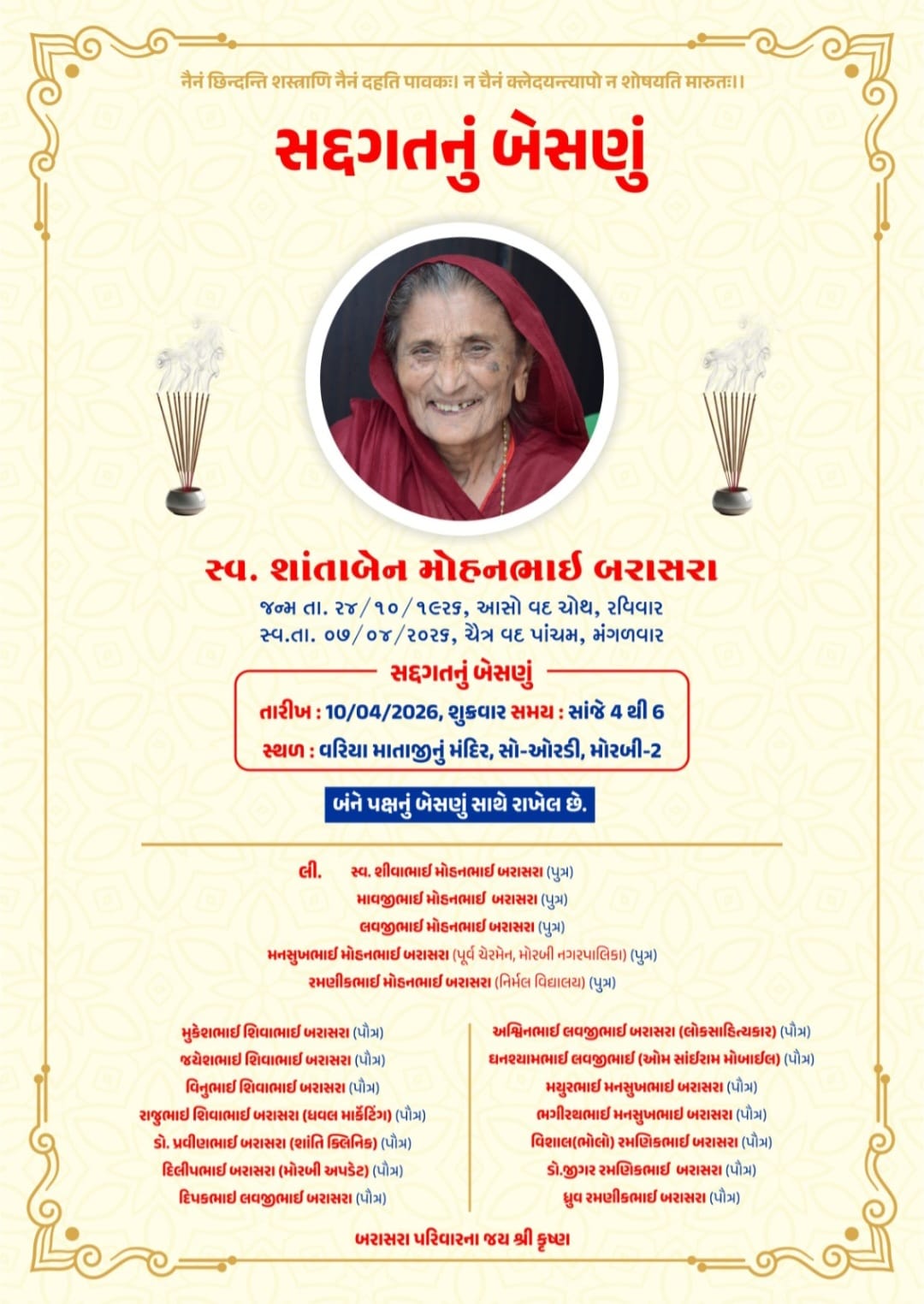 મોરબી શહેરના નિવાસી અને મોરબી અપડેટ ન્યૂઝ વેબ પોર્ટલના ચીફ તથા ફાઉન્ડર દિલીપભાઈ બરાસરાના દાદી શાંતાબેન મોહનભાઈ બરાસરાનું તા. ૦૭/૦૪/૨૦૨૬, મંગળવારે ૧૦૦ વર્ષની વયે અવસાન થયું છે. તેઓ સ્વ. શીવાભાઈ મોહનભાઈ બરાસરા, માવજીભાઈ મોહનભાઈ બરાસરા, લવજીભાઈ મોહનભાઈ બરાસરા, મનસુખભાઈ મોહનભાઈ બરાસરા(પૂર્વ ચેરમેન, મોરબી નગરપાલિકા) તથા રમણીકભાઈ મોહનભાઈ બરાસરા(નિર્મલ વિદ્યાલય)ના માતા હતા. સદગતનું બંને પક્ષનું બેસણું તા.૧૦/૦૪/૨૦૨૬, શુક્રવારે સાંજે ૪ થી ૬ વાગ્યા દરમિયાન મોરબીના સામાકાંઠે સો-ઓરડી વિસ્તારમાં આવેલ વરિયા માતાજીના મંદિર ખાતે રાખવામાં આવ્યું છે.