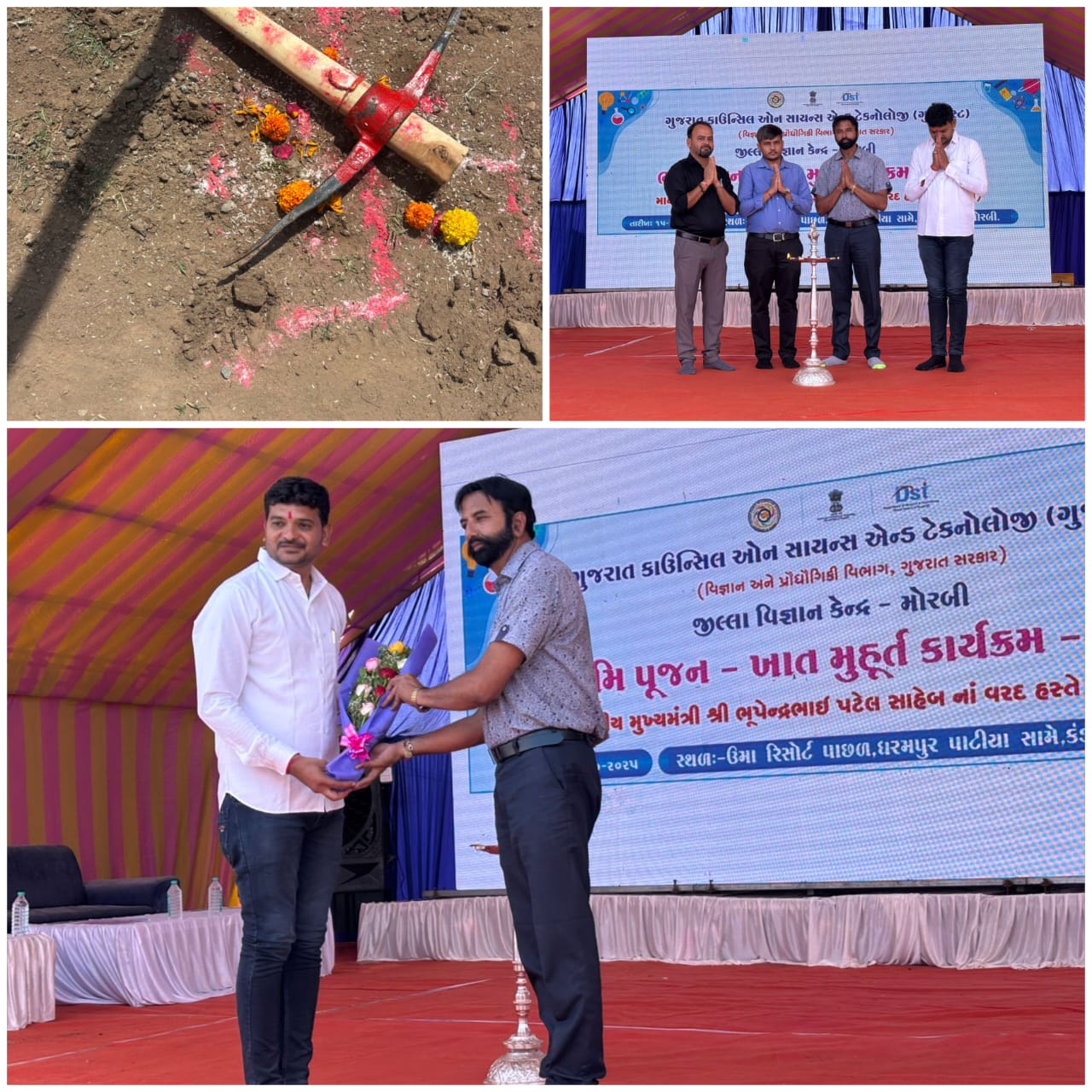 મોરબી: ગુજરાત સરકારના સાયન્સ એન્ડ ટેકનોલોજી વિભાગ હેઠળના ગુજરાત કાઉન્સિલ ઑન સાયન્સ એન્ડ ટેકનોલોજી (GUJCOST) દ્વારા મોરબી જીલ્લામાં ૨ એકર જમીન ઉપર ૧૦ કરોડના ખર્ચે જીલ્લા વિજ્ઞાન કેન્દ્રનું નિર્માણ થવાનું છે. આજે તા. ૧૫ ઓક્ટોબર, ૨૦૨૫ના રોજ સવારે ૧૦ વાગ્યે આ કેન્દ્રનું ભૂમિપૂજન વિધિવત્ પૂર્ણ થયું હતું.