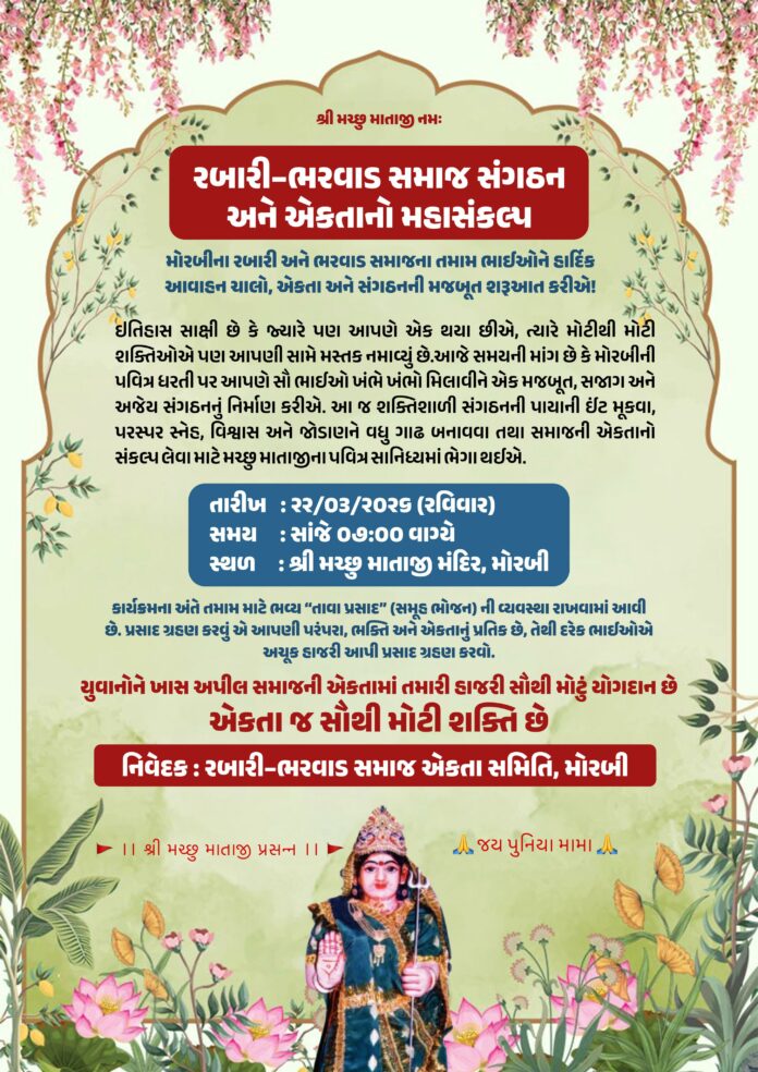 પ્રાપ્ત માહિતી અનુસાર, આજે 22 માર્ચ 2026, રવિવારના રોજ સાંજે 7:00 કલાકે મોરબીના મચ્છુ માતાજી મંદિરે આ કાર્યક્રમ યોજાશે. સંગઠનની પાયાની ઈંટ મૂકવા અને પરસ્પર સ્નેહ તથા વિશ્વાસ વધારવાના આ પ્રયાસના અંતે તમામ ઉપસ્થિત લોકો માટે ‘તાવા પ્રસાદ’ (સમૂહ ભોજન) ની વિશેષ વ્યવસ્થા રાખવામાં આવી છે. પ્રસાદ ગ્રહણ કરવો એ પરંપરા, ભક્તિ અને એકતાનું પ્રતીક હોવાથી દરેક ભાઈઓને સમયસર અચૂક હાજરી આપવા રબારી-ભરવાડ સમાજ એકતા સમિતિ દ્વારા જણાવાયું છે.