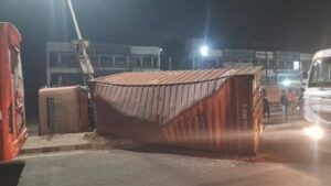 કન્ટેનર પલ્ટી મારી ગયુ બસના છોતરાં નિકળી ગયા મુસાફરો ના શ્ર્વાસ અધ્ધર
