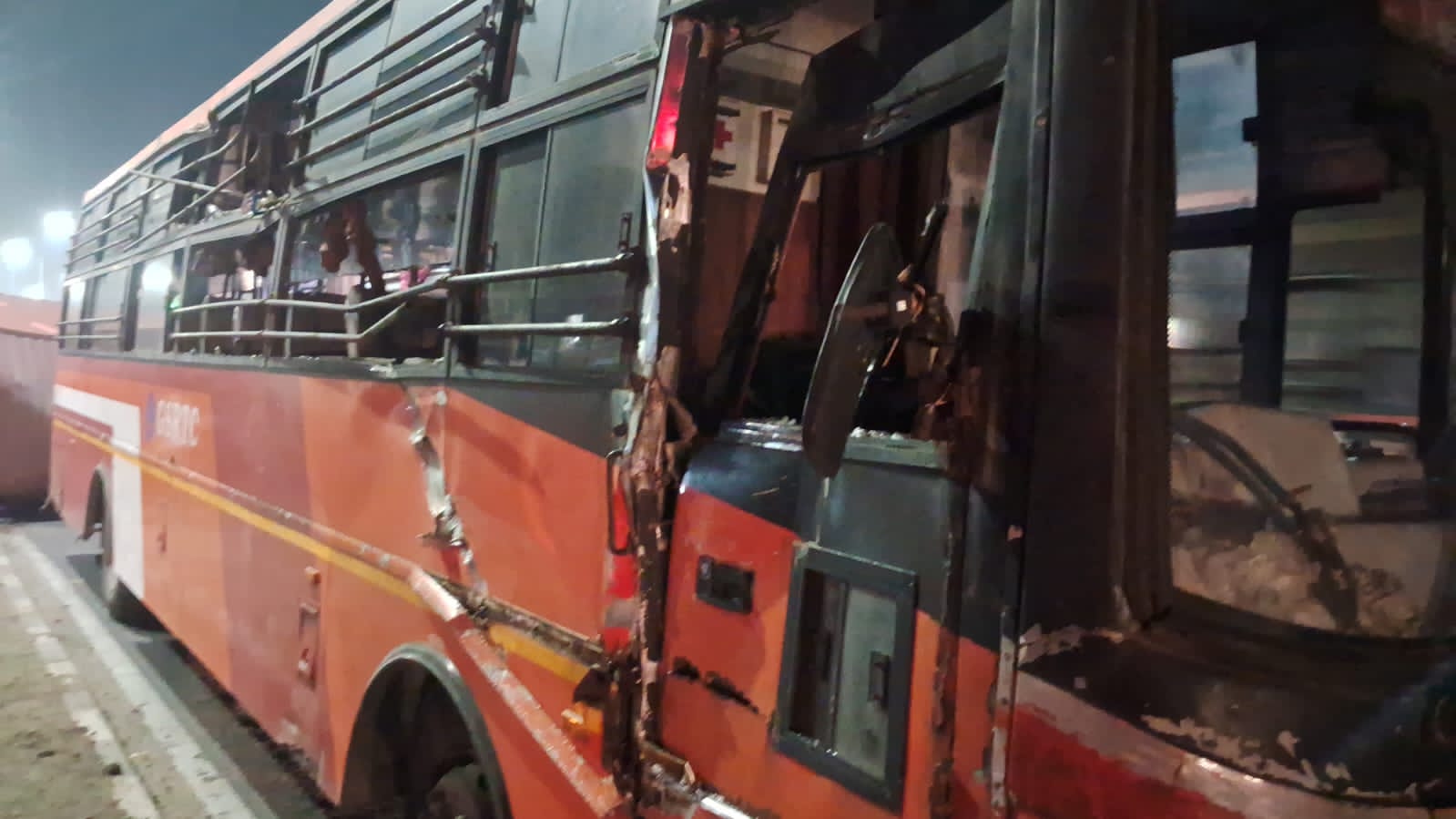 ટ્રક પલટી મારી સ્ટિટ લાઈટ ના પોલ સાથે ધડાકાભેર અથડાઈ રોગ સાઈડમાં પડ્યો બસ ની સાઈડના ભાગનો કચણધાણ નિકળી ગયો એ જોતાં અકસ્માત કેટલો ગંભીર છે એ સાબિત થાય છે.