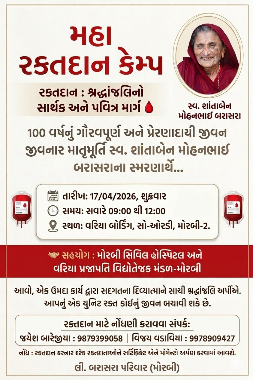 બરાસરા પરિવાર દ્વારા આયોજિત આ મહા રક્તદાન કેમ્પ આગામી તારીખ 17/04/2026 ને શુક્રવારના રોજ સવારે 09:00 થી 12:00 વાગ્યા સુધી વરિયા બોર્ડિંગ, સો-ઓરડી, મોરબી-2 ખાતે યોજાશે. આ સેવાકાર્યમાં મોરબી સિવિલ હોસ્પિટલ અને વરિયા પ્રજાપતિ વિદ્યોતેજક મંડળ-મોરબીનો વિશેષ સહયોગ પ્રાપ્ત થયો છે.