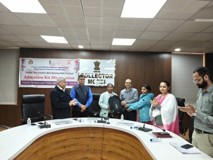 મોરબી: ‘બેટી બચાવો બેટી પઢાવો’ યોજના હેઠળ દીકરીઓના શિક્ષણને વેગ આપવા અને સમાજમાં દીકરીઓ પ્રત્યે સકારાત્મક દૃષ્ટિકોણ કેળવવાના ઉદ્દેશ્ય સાથે સરકારની પહેલ કરવામાં આવી છે. જેના ભાગરૂપે માર્ચ-૨૦૨૫માં લેવાયેલી ધોરણ ૧૦ અને ૧૨ની બોર્ડની પરીક્ષામાં પોતાની શાળા કક્ષાએ પ્રથમ, દ્વિતીય અને તૃતીય સ્થાન પ્રાપ્ત કરનાર દીકરીઓને પ્રોત્સાહિત કરવા માટે કલેક્ટર કે.બી. ઝવેરીના અધ્યક્ષસ્થાને સરકારી શાળાની તેજસ્વી દીકરીઓને એજ્યુકેશન કીટ વિતરણનો કાર્યક્રમ યોજાયો હતો. આ કાર્યક્રમ દરમિયાન દીકરીઓ ઉચ્ચ શિક્ષણ તરફ વધુ ઉત્સાહ સાથે આગળ વધે તેવા હેતુથી કલેક્ટરના હસ્તે પ્રતીકાત્મક રૂપે પાંચ દીકરીઓને એજ્યુકેશન કીટ અર્પણ કરવામાં આવી હતી.