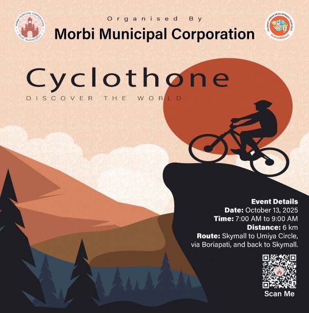 મોરબી મહાનગરપાલિકા દ્વારા આયોજિત વિકાસ સપ્તાહ ૨૦૨૫ ના ભાગરૂપે આગામી તા.૧૩/૧૦/૨૦૨૫ ના રોજ સવારે ૭:૦૦ થી ૯:૦૦ કલાકે મોરબી સાયક્લોથોન ૨૦૨૫ નું ભવ્ય આયોજન કરવામાં આવ્યું છે. આ સાયક્લોથોન ૬ કિમીનું રહેશે. જેમાં સ્કાયમોલ થી ઉમિયા સર્કલ, બોરિયાપાટી થઈને પરત સ્કાયમોલ આવવાનું રહેશે. ત્યારે સાયક્લોથોનમાં ભાગ લેવા માટે ઇચ્છુક મોરબીવાસીઓ માટે રજીસ્ટ્રેશન ખુલ્લું મુકવામાં આવ્યું છે. ત્યારે કાર્યક્રમને લઇ મનપા દ્વારા સૂચનો આપતા જણાવવામાં આવ્યું છે કે, રજીસ્ટ્રેશનની ડેડલાઇન ૧૨ ઓક્ટોબર, ૨૦૨૫ (રવિવાર)ની રહેશે. તેમજ કાર્યક્રમમાં ભાગ લેવા માટે સાયકલ અને હેલ્મેટ જરૂરી છે. તેમજ દરેક સ્પર્ધકે ફોર્મ અલગથી ભરવું જરૂરી છે. રજીસ્ટ્રેશન માટે :https://forms.gle/gJTvGMkiHkRtCxBy8 લિંક પર ફોર્મ ભરવાનું રહેશે.
