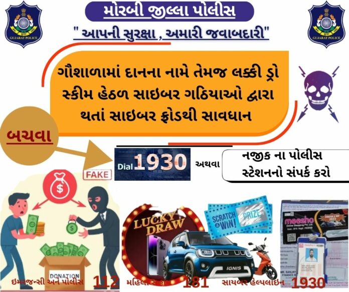 ભારતમાં સાયબર ક્રાઈમના બનાવો દિવસેને દિવસે વધી રહ્યા છે. ગૃહ મંત્રાલય દ્વારા તાજેતરમાં જાહેર કરાયેલા આંકડા અનુસાર, 2024માં સાયબર ફ્રોડના કેસોમાં 206%નો ઉછાળો નોંધાયો છે, જેમાં દેશભરમાં લોકોને રૂ.22,845 કરોડનું નુકસાન થયું છે. 2023માં આ આંકડો રૂ.7,465 કરોડ હતો, એટલે કે એક જ વર્ષમાં નાણાકીય છેતરપિંડીમાં ઘણો વધારો થયો છે. ત્યારે મોરબી જીલ્લા પોલીસ ” આપની સુરક્ષા, અમારી જવાબદારી” સૂત્રને સાબિત કરી ગૌશાળામાં દાનના નામે તેમજ લક્કી ડ્રો સ્કીમ હેઠળ સાઇબર ગઠિયાઓ દ્વારા થતાં સાઇબર ફ્રોડથી સાવધાન રહેવા અપીલ કરી છે. અને આવા ગઠિયાઓથી બચવા 1930 પર સંપર્ક કરવા અપીલ કરાઈ છે. અથવા નજીકના પોલીસ સ્ટેશનનો સંપર્ક કરવા જણાવવામાં આવ્યું છે.