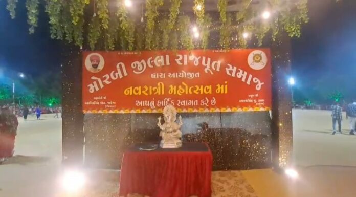 મોરબી જીલ્લા રાજપૂત સમાજ દ્વારા ન્યુ પેલેસ ખાતે પરંપરાગત રીતે ભવ્ય નવરાત્રી મહોત્સવનું આયોજન કરવામાં આવ્યું છે. તા. ૨૪ થી ૨૬ સપ્ટેમ્બર સુધી ચાલનારા આ ત્રણ દિવસીય મહોત્સવનો આજ રોજ શુભ પ્રારંભ થયો છે, જેમાં બહોળી સંખ્યામાં સમાજની બહેનો અને દીકરીઓ પરંપરાગત વસ્ત્રોમાં રાસ-ગરબા લેવા માટે ઉપસ્થિત રહ્યા હતા.