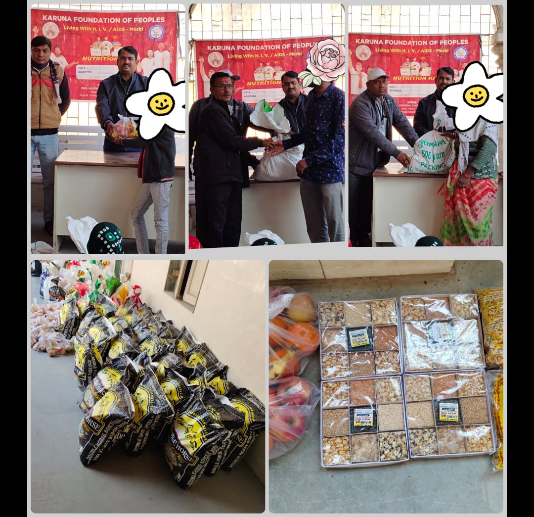 મોરબી જીલ્લાની કરુણા ફાઉન્ડેશન ઓફ પીપલ્સ લીવીંગ વિથ એચ.આઈ.વી./એઈડ્સ દ્વારા સામાજિક જવાબદારીના ભાગરૂપે PLHIV લાભાર્થીઓ માટે મંકરસંક્રાંત પર્વ નિમિત્તે સહાયકાર્ય હાથ ધરવામાં આવ્યું હતું. મુખ્ય જીલ્લા આરોગ્ય અધિકારી ડૉ. પી.કે. શ્રીવાસ્તવ તથા મોરબી સિવિલ હોસ્પિટલના એ.આર.ટી. એ.એમ.ઓ. ડૉ. યાદવના માર્ગદર્શન હેઠળ સિવિલ હોસ્પિટલ ખાતે આવેલા એ.આર.ટી. સેન્ટર પર નિયમિત સારવાર લઈ રહેલા સગર્ભા બહનો, ગંગાસ્વરૂપ બહેનો તેમજ બાળકોને પોષણયુક્ત આહાર માટે રાશન કીટ અને તહેવારની ખુશીમાં ચીકી, ફરસાણ તથા ફળનું વિતરણ કરાયું હતું.