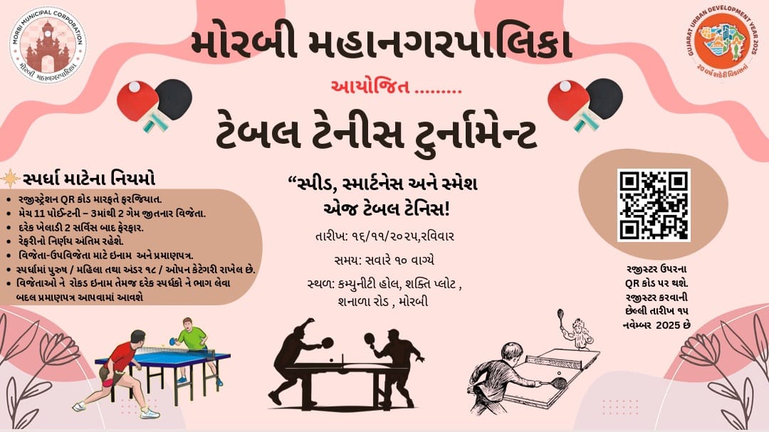 મોરબી શહેરના રમતપ્રેમી યુવાનોમાં ઉમંગ અને ઉત્સાહ જગાવવા મોરબી મહાનગરપાલિકા દ્વારા ટેબલ ટેનિસ ટુર્નામેન્ટનું આયોજન તારીખ ૧૬ નવેમ્બર ૨૦૨૫ને રવિવારના રોજ કરવામાં આવ્યું છે. શક્તિ પ્લોટ, શનાળા રોડ પર આવેલા કમ્યુનિટી હોલ ખાતે સવારે ૧૦ વાગ્યે સ્પર્ધાનો પ્રારંભ થશે. “સ્પીડ, સ્માર્ટનેસ અને સ્મેશ એજ ટેબલ ટેનિસ!” એવા ટેગલાઈન સાથે આ ઈવેન્ટ યુવા ટેલેન્ટને પ્રોત્સાહન આપવાનો પ્રયાસ છે. સ્પર્ધામાં પુરુષ, મહિલા, અંડર-૧૮ અને ઓપન કેટેગરી એમ કુલ ચાર કેટેગરી રાખવામાં આવી છે, જેથી દરેક વયજૂથ અને સ્તરના ખેલાડીઓને પ્રતિભા દર્શાવવાની તક મળે. ટુર્નામેન્ટ માટે રજીસ્ટ્રેશન માત્ર QR કોડ મારફતે જ સ્વીકારવામાં આવશે અને તેની છેલ્લી તારીખ ૧૫ નવેમ્બર નક્કી કરાઈ છે.