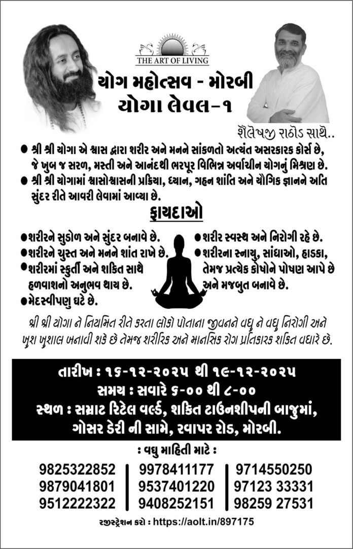 ધ આર્ટ ઓફ લિવિંગના જણાવ્યા અનુસાર, શ્રી શ્રી યોગા એ શ્વાસ દ્વારા શરીર અને મનને સાંકળતો અત્યંત અસરકારક કોર્સ છે, જે ખુબ જ સરળ, મસ્તી અને આનંદથી ભરપૂર વિભિન્ન અર્વાચીન યોગનું મિશ્રણ છે. શ્રી શ્રી યોગામાં શ્વાસોશ્વાસની પ્રક્રિયા, ધ્યાન, ગહન શાંતિ અને યૌગિક જ્ઞાનને અતિ સુંદર રીતે આવરી લેવામાં આવ્યા છે. યોગ કરવાના ઘણા ફાયદાઓ છે. જેમ કે, શરીરને સુડોળ અને સુંદર બનાવે છે. શરીર સ્વસ્થ અને નિરોગી રહે છે. શરીરને ચુસ્ત અને મનને શાંત રાખે છે. શરીરના સ્નાયુ, સાંધાઓ, હાડકા, તેમજ પ્રત્યેક કોષોને પોષણ આપે છે અને મજબુત બનાવે છે. શરીરમાં સ્કુર્તી અને શકિત સાથે હળવાશનો અનુભવ થાય છે અને મેદસ્વીપણ ઘટે છે. શ્રી શ્રી યોગા ને નિયમિત રીતે કરતા લોકો પોતાના જીવનને વઘુને વઘુ નિરોગી અને ખુશ ખુશાલ બનાવી શકે છે તેમજ શરીરિક અને માનસિક રોગ પ્રતિકારક શકિત વધારે છે. જેને લઇ ધ આર્ટ ઓફ લિવિંગ દ્વારા મોરબીના સમ્રાટ રિટેલ વર્લ્ડ, શકિત ટાઉનશીપની બાજુમાં, ગોસર ડેરી ની સામે, રવાપર રોડ ખાતે આગામી ૧૬-૧૨-૨૦૨૫ થી ૧૯-૧૨-૨૦૨૫ દરમિયાન સમય : સવારે ૬-૦૦ થી ૮-૦૦ વાગ્યે યોગ મહોત્સવ – મોરબીનું આયોજન કરવામાં આવ્યું છે. જેમાં ભાગ લેવા માટે https://aolt.in/897175 પર રજીસ્ટ્રેશન કરાવવું અનિવાર્ય છે.
