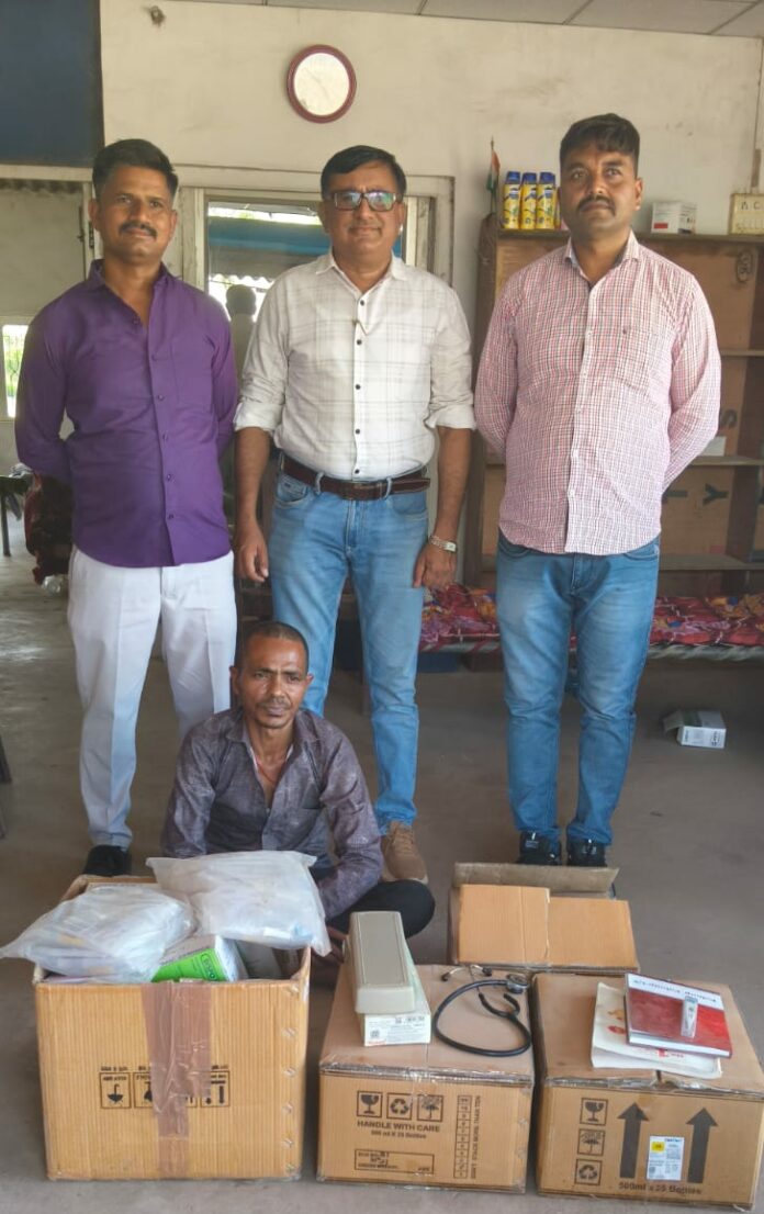 મળતી માહિતી અનુસાર, ઉચ્ચ અધિકારીઓની સૂચના અનુસાર ડીગ્રી વગર ડોક્ટરી પ્રેક્ટિસ કરતા ઇસમો સામે ઝુંબેશ હાથ ધરવામાં આવી હતી. તે દરમ્યાન એસ.ઓ.જી. ટીમને બાતમી મળી હતી કે, રાતાવિરડા રોડ પર રોસા સિરામીક સામે એક ઇસમ સુરેન્દ્રકુમાર રામનરેશ ગુપ્તા નામનો વ્યક્તિ ડીગ્રી વગર એલોપેથીક દવાઓથી દર્દીઓની સારવાર કરી રહ્યો છે. જેના આધારે તબીબી અધિકારી PHC ઢુવાના સહયોગથી સ્થળ પર રેડ કરવામાં આવી હતી. તપાસ દરમિયાન આરોપી પાસેથી વિવિધ પ્રકારની દવાઓ, ઇન્જેક્શન, તબીબી સાધનો સહિત કુલ રૂ. ૪૫,૧૦૦ નો મુદ્દામાલ કબજે કરવામાં આવ્યો હતો. પોલીસે આરોપી વિરુદ્ધ બી.એન.એસ. ૨૦૨૩ અને ગુજરાત મેડિકલ પ્રેક્ટિશનર એક્ટ હેઠળ ગુનો નોંધી વધુ કાર્યવાહી હાથ ધરી છે.