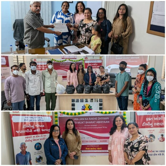 મોરબીમાં વિશ્વ ટીબી દિવસ નિમિત્તે મુસ્કાન વેલ્ફેર સોસાયટી દ્વારા સતત ચોથા વર્ષે ૫ ટીબી દર્દીઓને દત્તક લઈ પૌષ્ટિક આહાર કિટ આપવાની સેવા હાથ ધરાઈ. દર્દીઓના આરોગ્ય સુધારવા આ પહેલ મહત્વપૂર્ણ માનવામાં આવી રહી છે.