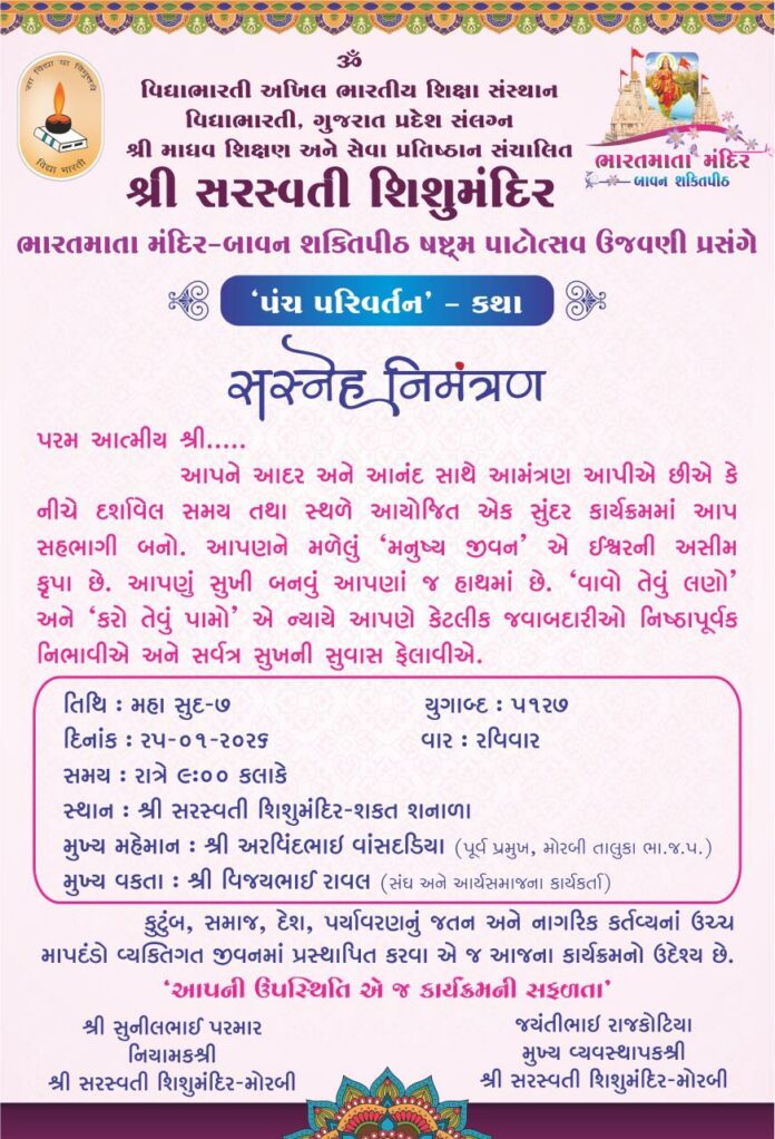 વિદ્યાભારતી અખિલ ભારતીય શિક્ષા સંસ્થાન, વિદ્યાભારતી, ગુજરાત પ્રદેશ સંલગ્ન તથા શ્રી માધવ શિક્ષણ અને સેવા પ્રતિષ્ઠાન સંચાલિત દ્વારા ભારતમાતા મંદિર-બાવન શક્તિપીઠ ષક્ષ્મ પાટોત્સવ ઉજવણી પ્રસંગે ‘પંચ પરિવર્તન’ કથાનું આગામી તા.૨૫-૦૧-૨૦૨૬ ને રવિવારના રોજ રાત્રે ૯:૦૦ કલાકે શ્રી સરસ્વતી શિશુમંદિર-શકત શનાળા ખાતે ભવ્ય આયોજન કરવામાં આવ્યું છે. જેને લઇ આયોજકો દ્વારા જણાવ્યું છે કે, “આપણને મળેલું ‘મનુષ્ય જીવન’ એ ઈશ્વરની અસીમ કૃપા છે. આપણું સુખી બનવું આપણા જ હાથમાં છે. ‘વાવો તેવું લણો’ અને ‘કરો તેવું પામો’ એ ન્યાયે આપણે કેટલીક જવાબદારીઓ નિષ્ઠાપૂર્વક નિભાવીએ અને સર્વત્ર સુખની સુવાસ ફેલાવીએ.” આ કાર્યક્રમમાં મુખ્ય વકતા તરીકે વિજયભાઈ રાવલ (સંઘ અને આર્યસમાજના કાર્યકર્તા) ઉપસ્થિત રહેશે. તેમજ મુખ્ય મહેમાનમાં અરવિંદભાઈ વાંસદડિયા (પૂર્વ પ્રમુખ, મોરબી તાલુકા ભા.જ.પ.) ખાસ હાજરી આપશે.