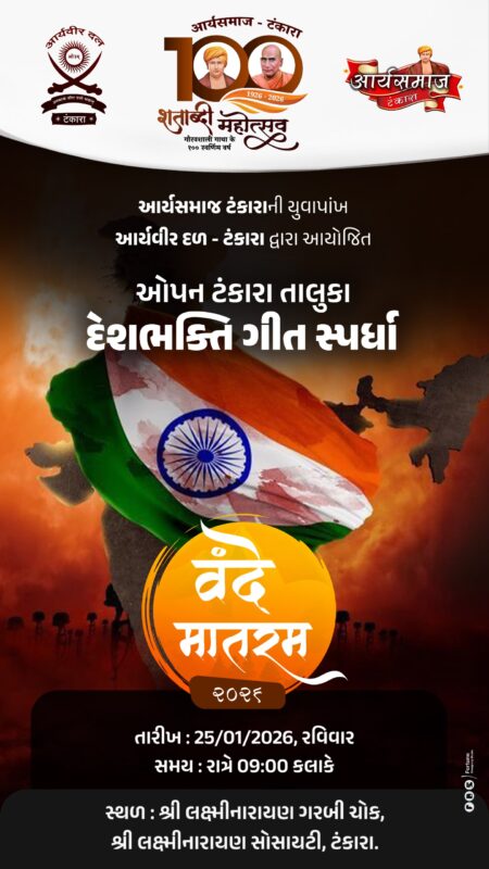 ટંકારા: આર્ય સમાજ ટંકારાની યુવાપાંખ આર્યવીર દળ દ્વારા છેલ્લા 42 વર્ષની ભવ્ય પરંપરાને જાળવી રાખીને, આ વર્ષે પણ 77માં પ્રજાસત્તાક પર્વની પૂર્વ સંધ્યાએ ‘ઓપન ટંકારા તાલુકા દેશભક્તિ ગીત સ્પર્ધા’નું આયોજન કરવામાં આવ્યું છે. આગામી 25 જાન્યુઆરી 2026, રવિવારના રોજ રાત્રે 9:00 કલાકે શ્રી લક્ષ્મીનારાયણ ગરબી ચોક સોસાયટી, ટંકારા ખાતે આ કાર્યક્રમ યોજાશે.