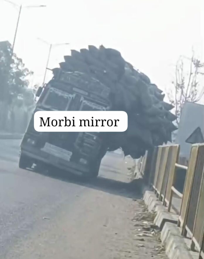 ટંકારા તાલુકાના એક્ઝિક્યુટિવ મેજિસ્ટ્રેટ કચેરી પાસે પોલીસ સ્ટેશન સામેના માર્ગ પર નિયમોને નેવે મૂકીને ઓવરલોડેડ ટ્રક પસાર થઈ રહ્યો હતો. ત્યારે અચાનક ટ્રકની તાણીયા તૂટી જતાં તીવ્ર તડાકા-ભડાકાના અવાજ સાથે ટ્રક નમી ગયો અને મગફળીથી ભરેલા આકાશને આંબે એવા કોથળા રસ્તા પર ઢળી પડ્યા.