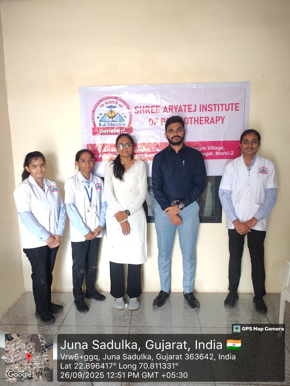 શ્રી આર્યતેજ ઇન્સ્ટિટ્યૂટ ઑફ ફિઝીયોથેરાપી દ્વારા સંચાલીત શ્રી આર્યતેજ ફિઝીયોથેરાપી ક્લીનિક, મોરબી દ્વારા નવા સાદુલકા ખાતે ૨૬ સપ્ટેમ્બર ૨૦૨૫ ના રોજ ફિઝીયોથેરાપી કેમ્પનું આયોજન કરવામાં આવ્યું હતુ. જે આરોગ્ય કેમ્પમાં કુલ ૩૫ દર્દીઓને આરોગ્ય લાભ મળ્યો હતો. ફિઝીયોથેરાપી કેમ્પનું નેતૃત્વ ડૉ.મોહિત ડાંગર અને ડૉ. અવની કાંજીયા દ્વારા કરવામાં આવ્યું હતું અને તે ડૉ. રાહુલ છતલાણીના માર્ગદર્શન હેઠળ સફળતાપૂર્વક સંચાલિત થયું હતું. દર્દીઓની તપાસ ઉપરાંત જાગૃતિ પ્રવૃત્તિઓમાં પણ સહભાગી બન્યા હતા, વિશેષ નોંધનીય બાબત એ હતી કે, બધા ડૉક્ટર દ્વારા લોકોને ફિઝિયોથેરાપી શું છે ? અને તેના લાભ વિશે જાગૃતિ ફેલાવી. આ કેમ્પ દ્વારા સ્થાનિક રહેવાસીઓને વ્યાપક સ્વાસ્થ્યલાભ મળ્યો અને આરોગ્ય જાગૃતિ પણ સર્જાઈ હતી. શ્રી આર્યતેજ ગ્રૂપ ઑફ ઇન્સ્ટિટ્યૂશન્સના મેનેજમેન્ટ દ્વારા ઇન્સ્ટિટ્યૂટના ફેકલ્ટીના સેવાભાવી પ્રયત્નોની પ્રશંસા કરવામાં આવી હતી અને ભવિષ્યમાં પણ આવા આરોગ્ય કેમ્પોનું આયોજન થતું રહે તેવી ઇચ્છા વ્યક્ત કરવામાં આવી.”