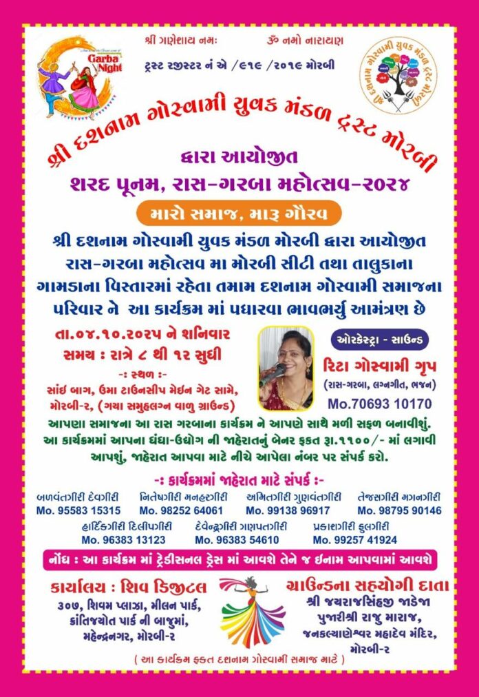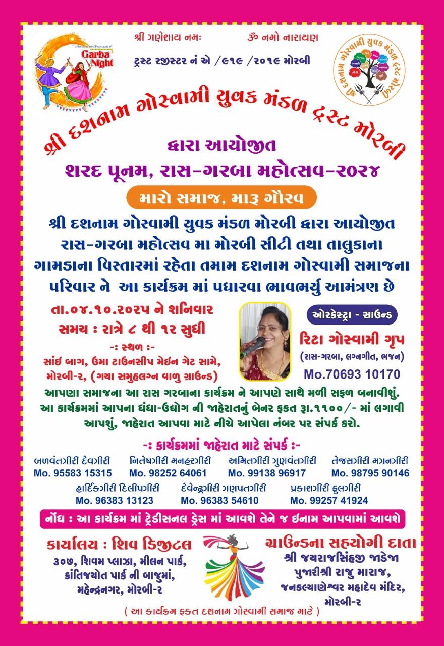 શ્રી દશનામ ગોસ્વામી યુવક મંડળ મોરબી દ્વારા દશનામ ગોસ્વામી સમાજ માટે શરદ પૂનમ, રાસ-ગરબા મહોત્સવનું જાજરમાન આયોજન કરવામાં આવ્યું છે. ત્યારે મોરબી શહેર તથા તાલુકાના ગામડાના વિસ્તારમાં રહેતા તમામ દશનામ ગોસ્વામી સમાજના પરિવારને આ કાર્યક્રમમાં પધારવા આયોજકો દ્વારા ભાવ ભર્યું આમંત્રણ પાઠવવામાં આવ્યું છે.
