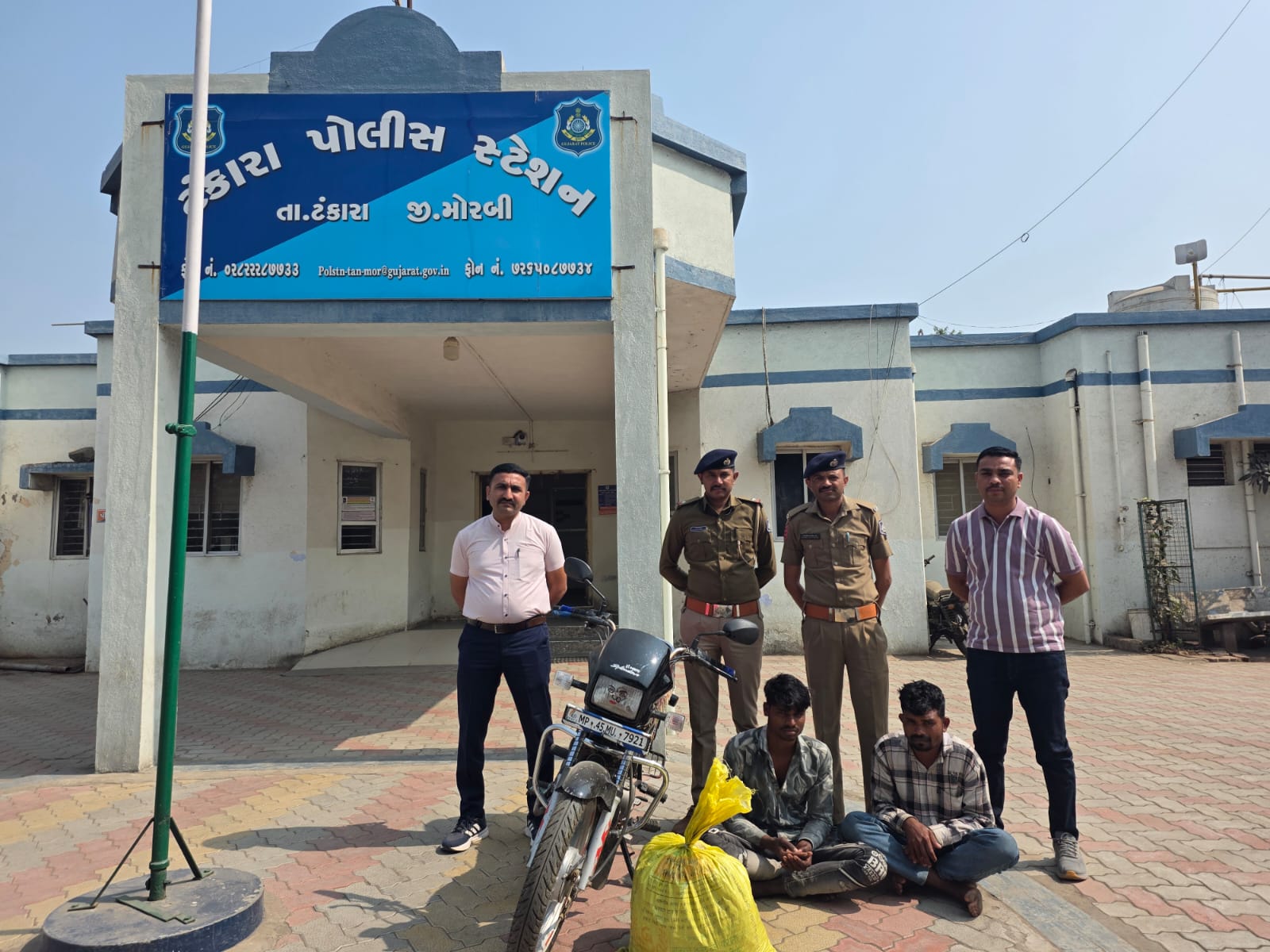 ટંકારા તાલુકાના ગજડી ગામે અલગ અલગ વાડી વિસ્તારમાંથી કોપર વાયરની ચોરી થયેલ હોવાની નોંધાયેલ ફરિયાદને આધારે ટંકારા પોલીસ મથક પીઆઇ કે.એમ.છાસીયાની સુચના તેમજ માર્ગદર્શન મુજબ ટંકારા પોલીસ ટીમ પેટ્રોલીંગમાં હતા. દરમ્યાન બે ઇસમો મોટર સાયકલમાં પ્લાસ્ટીકનુ બાચકુ લઇ નીકળતા જે શંકાસ્પદ જણાઇ આવતા મજકુર બન્ને ઇસમોને રોકી મોટર સાયકલમાં રાખેલ પ્લાસ્ટીકના બાચકામાં તપાસ કરતા કોપર વાયરના ગુંચરા ભરેલ હોય જે કોપર વાયરના આધાર પુરાવા બીલ માંગતા ગલ્લા તલ્લા કરી કોઇ સંતોષકારક જવાબ આપતા ન હોય જેથી બન્ને ઇસમોની યુકિત-પ્રયુકિતની સઘન પુછપરછ કરતા તા.૦૨/૦૨/૨૦૨૬ થી તા.૦૩/૦૨/૨૦૨૬ ના રાત્રીના સમયે ગજડી ગામે અલગ અલગ વાડી વિસ્તારમાંથી કેબલ ચોરી કરેલ હોવાની કબુલાત આપતા હોય જેથી જરૂરી પુરાવાઓ એકત્રીત કરી આરોપી પારસીંગ મંગુભાઇ ડામોર ઉવ-૩૪ રહે. હાલ-ગજડી તા-ટંકારા મુળગામ- ચોટીયા બયડી તડવી ફળીયુ તા-જોબટ જી-અલીરાજપુર (એમ.પી) તથા આરોપી અનીલભાઈ ગુમાનભાઇ પસાયા ઉવ.૨૪ રહે-હાલ ગજડી તા-ટંકારા મુળગામ-તેજારીયા તડવી ફળીયુ તા-કાલીદેવી જી-જામ્બુવા (એમ.પી) વાળાની અટક કરવામાં આવી હતી. આ સાથે પોલીસે આરોપી પાસેથી ૨૫ કિલો કોપર વાયર કિ.રૂ.૧૨,૫૦૦/-, હીરો સ્પ્લેન્ડર પ્લસ રજી.નં. એમપી-૪૫-એમયુ-૭૯૨૧ કિ.રૂ.૨૫ હજાર તથા ત્રણ નંગ મોબાઇલ કિ.રૂ.૧૫ હજાર સહિત રૂ.૫૨,૫૦૦/-નો મુદ્દામાલ કબ્જે લેવામાં આવ્યો હતો.