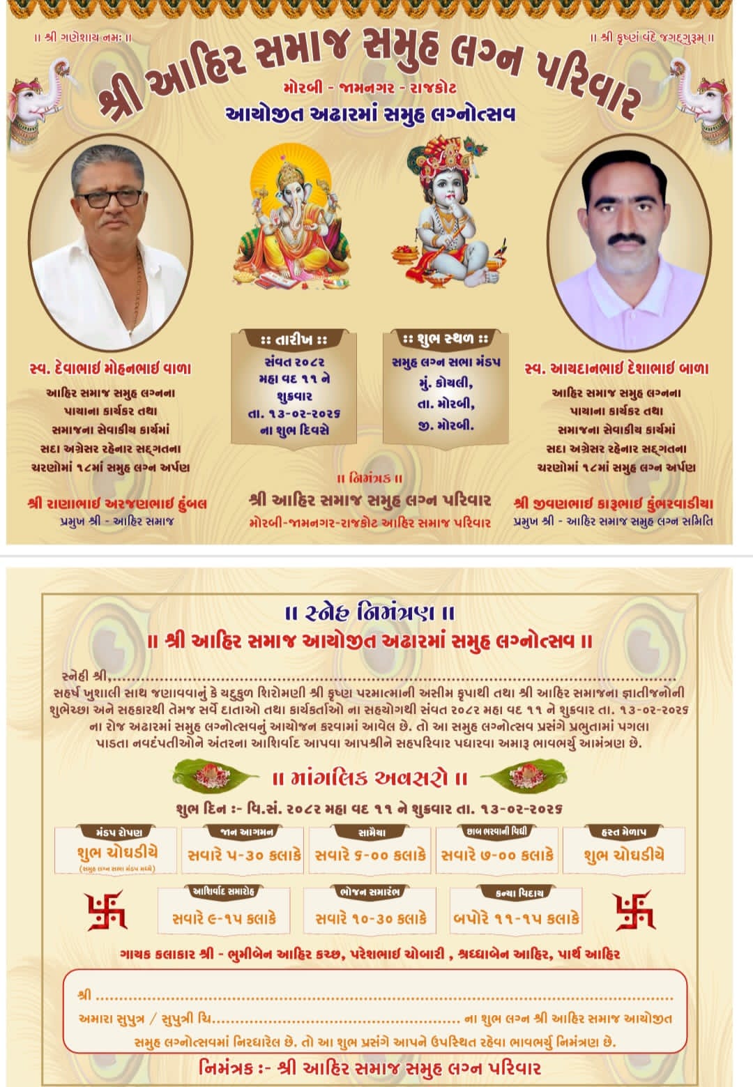 મોરબી-જામનગર-રાજકોટ આહિર સમાજ સમૂહ લગ્ન પરિવાર દ્વારા શુક્રવાર તા. ૧૩-૦૨-૨૦૨૬ના રોજ કોયલી ગામ ખાતે અઢારમા સમૂહ લગ્નોત્સવનું આયોજન કરવામાં આવ્યું છે.
