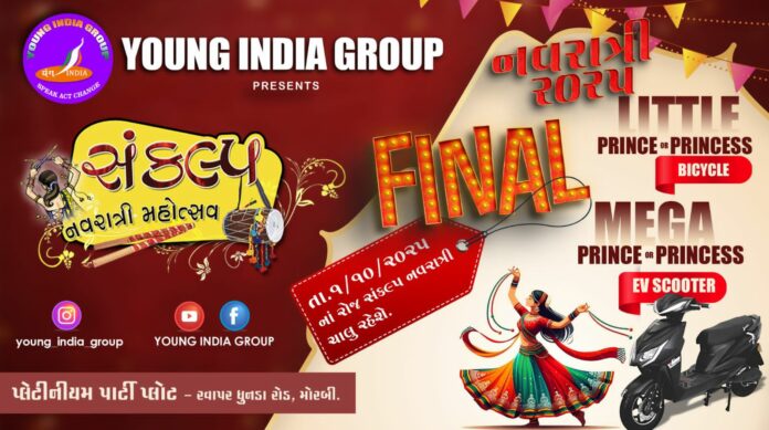 મોરબીમાં યંગ ઇન્ડિયા ગ્રુપ દ્વારા રવાપર-ઘુનડા રોડ ઉપર પ્લેટીનિયમ પાર્ટી પ્લોટ ખાતે સંકલ્પ નવરાત્રી મહોત્સવનું આયોજન કરાયું છે. જેમાં દરરોજ મોટી સંખ્યામાં બહેનો નિઃશુલ્ક એન્ટ્રી મેળવી સલામત વાતાવરણમાં ગરબે ઘૂમી રહી રહી છે. ગત રવિવારના રોજ સાતમા નોરતે વરસાદનું વિઘ્ન આવતા આ નવરાત્રી મહોત્સવમાં ખેલૈયાઓની સલામતીને ધ્યાનમાં રાખીને રજા જાહેર કરવામાં આવી હતી. જેથી હવે આ મહોત્સવ એક દિવસ લંબાવવામાં આવ્યો છે.