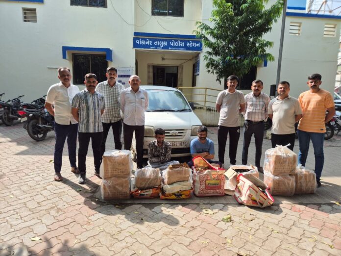 મળતી માહિતી અનુસાર, વાંકાનેર તાલુકા સર્વેલન્સ ટીમે બાતમીના આધારે વાંકાનેર તાલુકાના ઢુવા ઓવરબ્રીજ પાસેથી GJ-03-EL-1875 નંબરની સેંટ્રો કારને રોકી તેમાં તપાસ કરતા કારમાંથી ભારતીય બનાવટની વિદેશી દારૂની ૧૧૦ બોટલનો રૂ. ૧,૫૪,૦૦૦/-નો મુદ્દામાલ મળી આવતા પોલીસે કાર, વિદેશી દારૂ તથા ૦૨ મોબાઈલ ફોન મળી કુલ રૂ.૩,૧૪,૦૦૦/-ના મુદ્દામાલ સાથે વિપુલભાઈ પ્રવિણભાઈ ચાવડા તથા ગજાનંદભાઈ ભરતભાઈ મહતો નામના બે ઇસમોને પકડી પાડી તેમજ પકડાયેલ વિદેશી દારૂનો જથ્થો મોકલનાર વિનાભાઈ (રહે.વિંછીયા તા.વિછીયા જી.રાજકોટ) હાજર નહી મળી આવતા તેને શોધી કાઢવા ચક્રો ગતીમાન કરી ત્રણેય આરોપીઓ વિરૂધ્ધ પ્રોહિબિશન એક્ટ મુજબનો ગુન્હો નોંધી કાયદેસરની કાર્યવાહી હાથ ધરી છે.